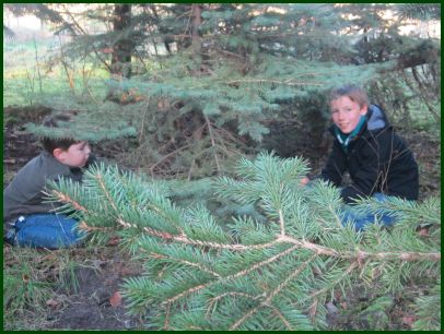 Jungs fällen Tannenbäume für die Reithalle