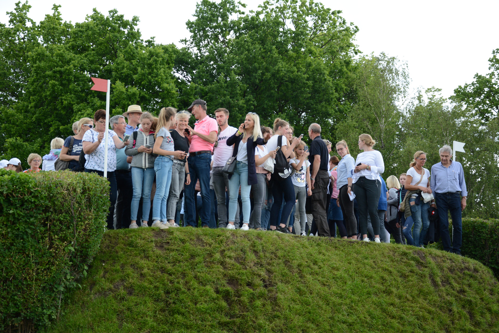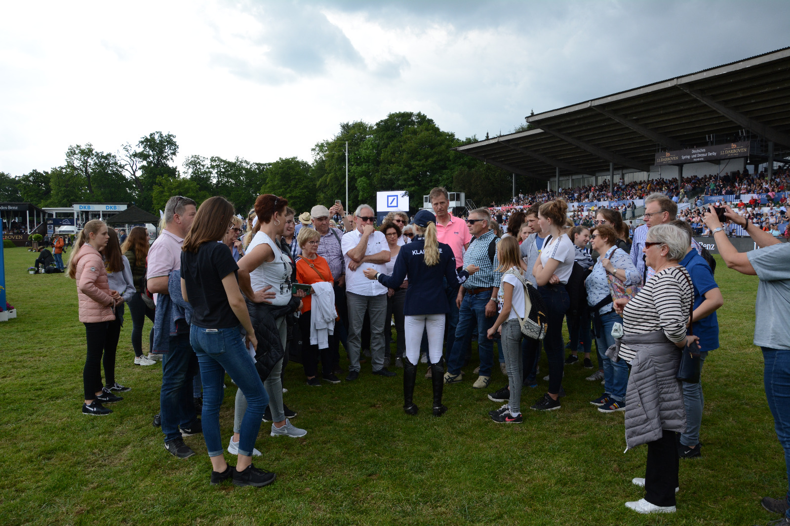 Am Freitag ging es für 60 Mitglieder zum Hamburger Derby in Hamburg-Klein Flottbek. Um sieben Uhr startete der Bus von den Reithallen in der Hohen Ward. Das Orgateam sorgte mit Snacks und kühlen Getränken für das leiblich Wohl während der Busfahrten und kümmerte sich darum, dass es allen an nichts fehlte. Nach Fahrerwechsel, kurzer Erfrischungspause und diversen Engpässen in Klein Flottbek erreichte die Gruppe das Ziel um viertel nach 11. Während viele zunächst die vielfältigen Shoppingmöglichkeiten auf dem Derbygelände nutzten, zog es die anderen direkt zum Springplatz, wo der Equiline Youngster Cup bereits im vollen Gange war. „Der Platz ist überhaupt nicht so groß wie er im Fernsehen aussieht“, hieß es von einem der jüngeren Vereinsmitglieder. Das tat der Spannung und den beeindruckenden Leistungen der Reiterinnen und Reiter allerdings keinen Abbruch. Das Highlight des Tages war jedoch die Parcoursbesichtigung mit Laura Klaphake. Die erfolgreiche deutsche Springreiterin, die unter anderem deutsche Meisterin der Springreiterinnen 2017 und mit der deutschen Mannschaft Siegerin des Nationenpreises in Aachen 2018 war, gab den pferdebegeisterten Alberslohern interessante Einblicke in den Ablauf des Parcours. Und auch den legendären Wall durften die Albersloher begehen und sich selbst ein Bild davon machen, welche Höhe Pferd und Reiter hier überwinden müssen. Anschließend begann die 2. Qualifikation für das große Derby am Sonntag und die Albersloher betrachteten die Ritte mit den vorher gewonnen Eindrücken noch viel genauer. Am Ende des Tages waren sich alle einig: Ein sehr spannender Tag mit tollem Reitsport und erfolgreicher Shoppingtour lag hinter den Vereinsmitgliedern.