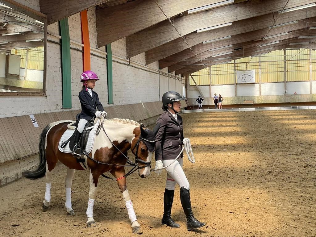 Gemeinsam mit ihrer Reitlehrerin Annika Bloem machte sich Emilia Schnekenburger mit unserem Vereinspony Georgi auf den Weg zum PM-Schulpferdeturnier in Hiltrup. Dort belegten die Beiden in der Führzügelklasse mit der Wertnote 7,7 den 3. Platz.