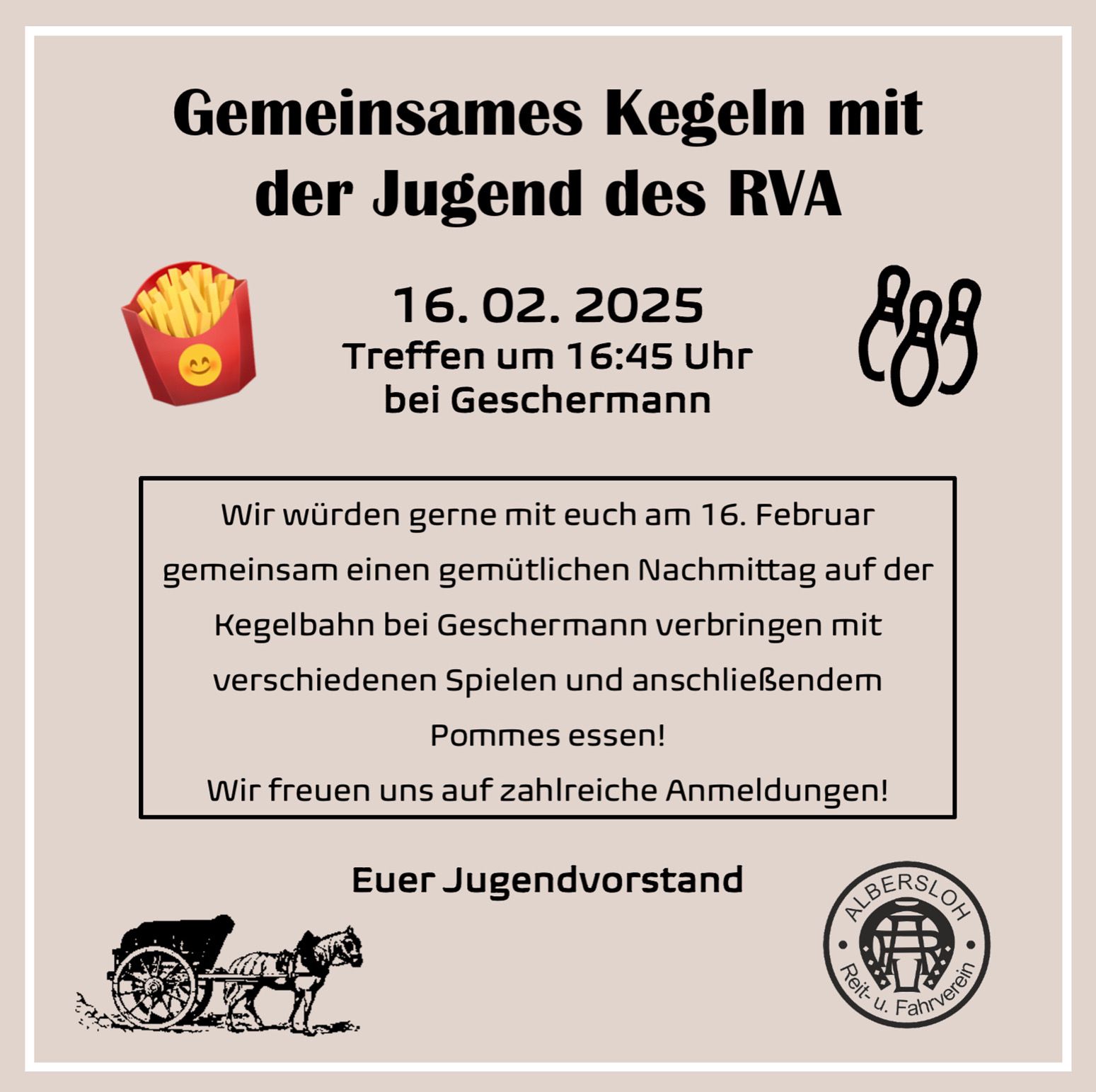Kegelnachmittag der RVA Jugend Feb.162025Fehler: Bitte Uhrzeit zurücksetzen.Ort: Gaststätte GeschermannSpass | Vereinsintern